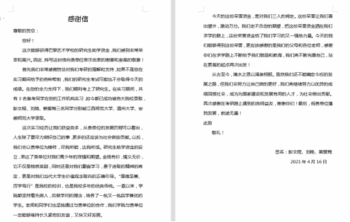 受资助的学生们表示:今天的这份荣誉资金,是对我们三人的肯定,让我们喜出望外,激动万分。我们定不负期望,把这份荣誉洒在我们求学的路上,为自己增添一股强劲动力!