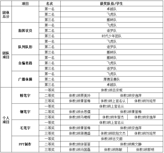 本次认知实训活动将2021级体育教育3个班级组成了六支队伍,分别由李芳辉、肖军、刘兵、杨庚、郭萍和彭世罕带领的时代少年团、逐梦队、搬砖队、卓越队、飞虎队和厚德至善队。考核的主要内容包括粉笔字、钢笔字和毛笔字的“三字比赛”,PPT说课课件制作比赛,技能考核和队列队形、“舞动青春”广播体操、大课间自编操比赛四大板块。