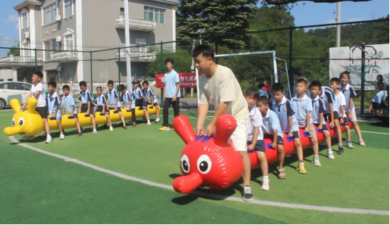 汇报演出首先呈现的是“强国有我”朗诵与《黄河大合唱》的巧妙结合。小朋友们以真挚的情感、清澈的童声,与激昂的旋律交相辉映,展现了新时代少年的铿锵誓言与爱国情怀。紧接着,防溺水情景剧以其寓教于乐的形式,深刻传达了防溺水安全知识,提高了大家的安全防范意识。随后,活力四射的啦啦操《上春山》以动感的节拍和青春的活力,瞬间点燃了现场氛围,为接下来的亲子趣味运动会预热了气氛。