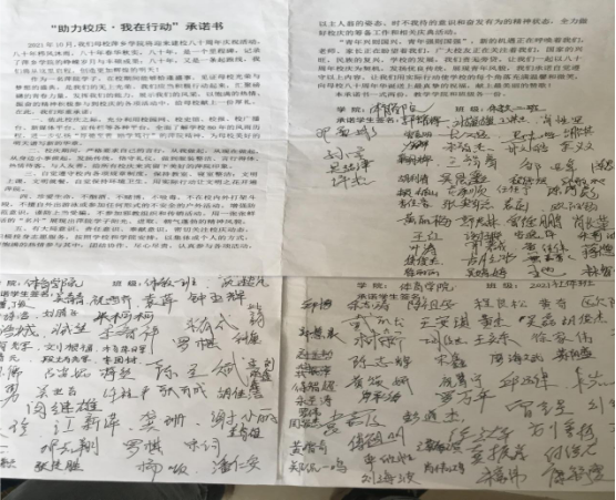 会上动员学生积极参与校庆活动,对参加校庆文艺晚会活动的同学进行了肯定和鼓励,其次,会上强调了作为学生“讲文明、讲卫生、守纪律”的基本要求;鼓励同学生做到尊师重教的课堂礼仪、互敬互爱的寝室礼仪、谦恭节俭的餐厅礼仪、热情大方的社交礼仪,彰显大学生知书达礼、阳光向上的文明气质;引导学生立志“为学校发展当先锋,为学校校庆做贡献”。此外,宣读“助力校庆•我在行动”承诺书,让学生了解承诺书的内容,组织各班在承诺书上签名,让同学们更加清晰自己在校庆工作中的角色和职责。