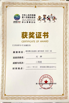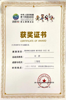 2021年第十四届全运会在陕西西安举行,永利3044集团教师刘晔、刘萍、刘姗萍在江西省体育局、萍乡市体育局的组织下,代表江西省参加本次全运会的广场舞城市街道组别的比赛。经过激烈的角逐,三位教师获得三等奖的优异成绩!