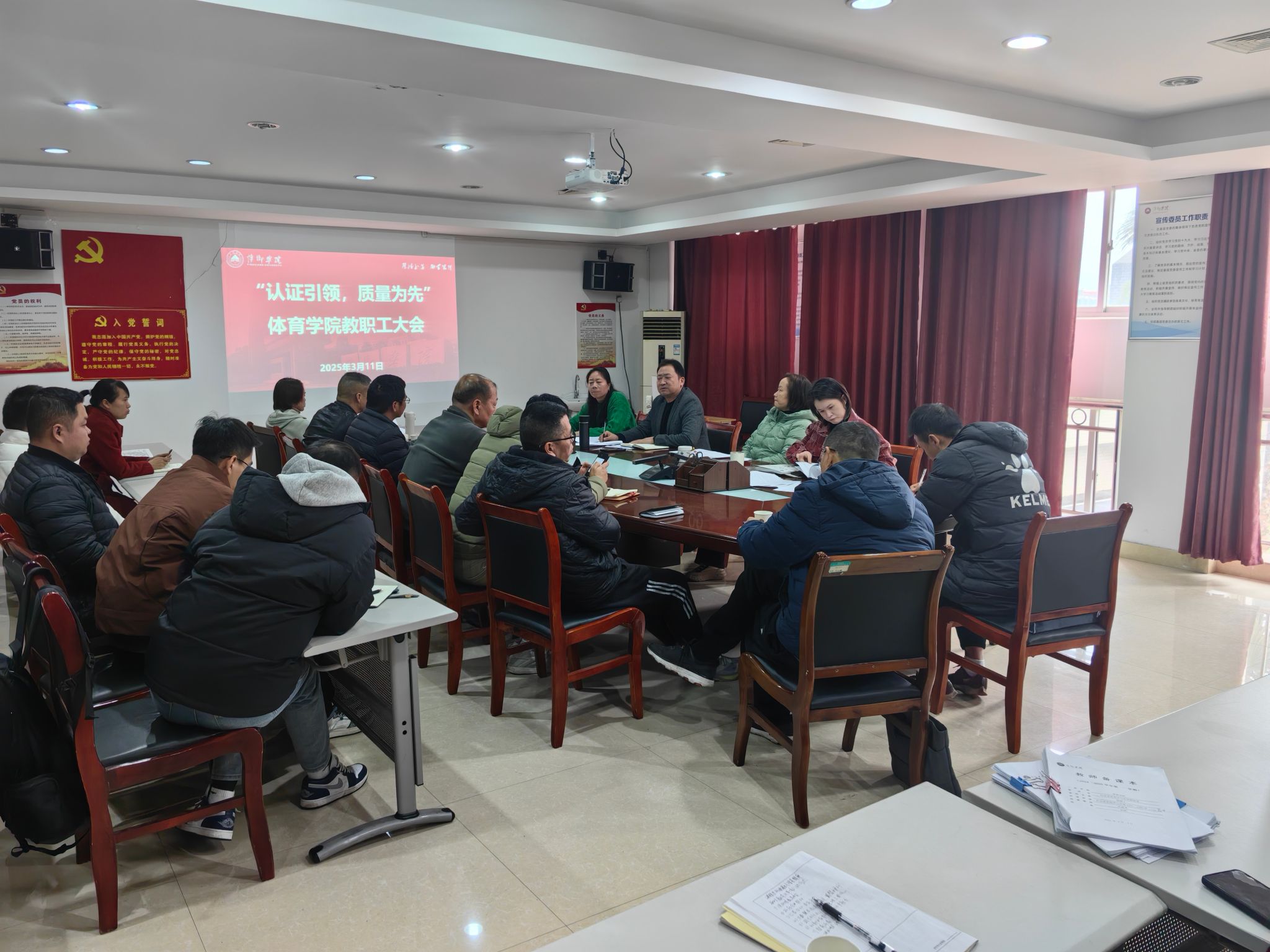 为积极迎接师范类专业认证,扎实做好体育教育师范类专业认证各项准备工作,3月11日,永利3044集团召开了以“认证引领 质量为先”为主题的教职工大会。会议由院长陈岷主持,学院全体教职工共同参会。