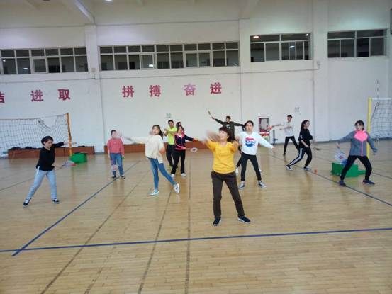 刘老师首先对柔力球握拍方法、持球动作以及基本技术动作进行了详细的讲解与示范,所有到场的老师跟着刘老师练习。经过一个多小时的练习,多位老师学习成效显著,熟练掌握了持球左右摆动、抛接、翻拍的动作,也得到了老师的认可。还有几位老师对网式竞技性的动作掌握较好,能够进行简单的比赛。