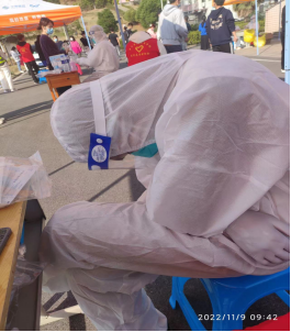 一晚上的不眠不休,他没有停止志愿服务的步伐,早晨五点多便又起床前往学校一食堂集合进行核酸志愿服务。由于前一天晚上没有充足睡眠,在检测点没有同学来做核酸时趴在桌上就睡着了,对胡文健同学默默付出、不辞辛苦的精神,学院和学院领导为他点赞!