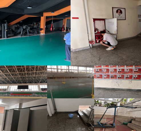 一是对室外篮球场进行了全面的排查,经排查发现:大门破损,存在安全隐患,需加固维修。二是对风雨球馆、足球场、网球场排查,未发现安全隐患。三是对体育馆所有场馆进行排查,经排查发现:所有配备的灭火器已过期,须更换灭火器;安全指示灯有部分损坏,须更换;一楼和二楼楼道墙面脱落,须修补粉刷;一楼男厕所隔门脱离松动,存在安全隐患,需加固维修。四是对体育馆楼顶进行排查,有漏水情况,需维修。