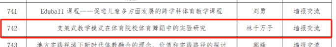 10月21日,由中国教育科学研究院、国家体育总局体育科学研究所组织实施的“中华人民共和国第一届学生(青年)运动会科学论文报告会”已完成评审工作,发布入选论文名单开始公示。青年教师林千万子写的《支架式教学模式在体育院校体育舞蹈中的实验研究》成功入选。向林千万子教师致以诚挚的祝贺!