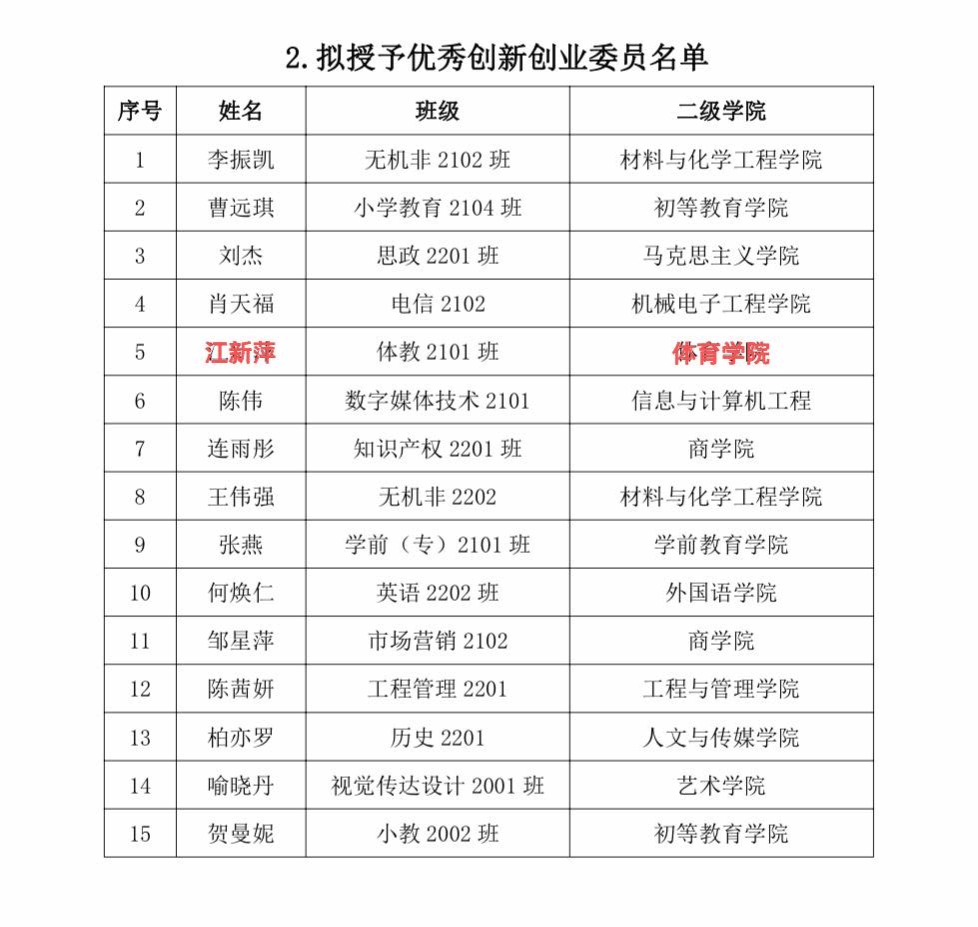 我院体育教育2101班江新萍同学荣获“优秀创业委员”!
