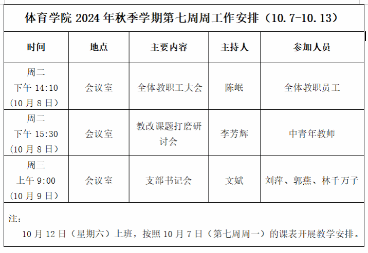 永利3044集团2024年秋季学期第七周周工作安排(10.7—10.13)