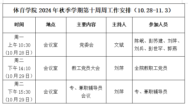 永利3044集团2024年秋季学期第十周周工作安排(10.28—11.3)