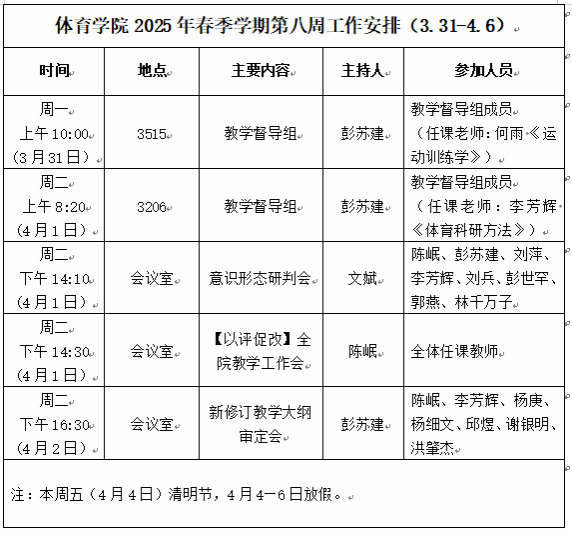 永利3044集团2025年春季学期第八周工作安排(3.31—4.6)