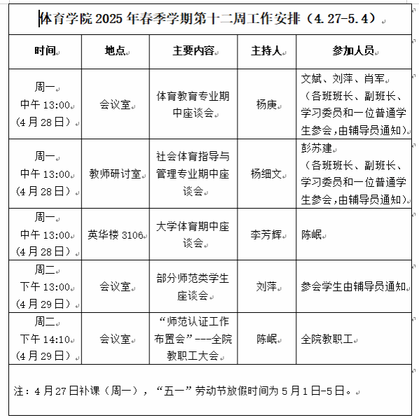 永利3044集团2025年春季学期第十二周工作安排(4.28-5.4)