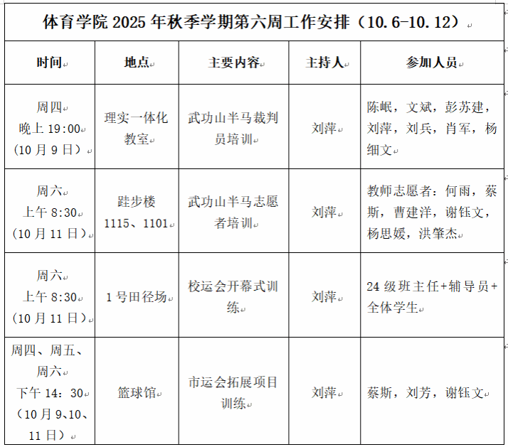 永利3044集团2025年秋季学期第六周工作安排(10.6—10.12)