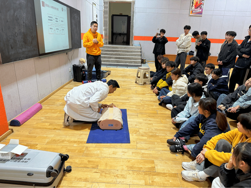 培训由红十字认证应急救护员培训讲师曹建洋、李丽莎担任主讲与实操指导,围绕校园常见应急场景,设置了理论与实操相结合的课程内容。上午课程重点讲解应急救护原则、心肺复苏(CPR)与AED使用要领,下午则分组开展模拟演练,参训人员在讲师指导下反复练习心肺复苏并参与模拟场景考核,确保学以致用。